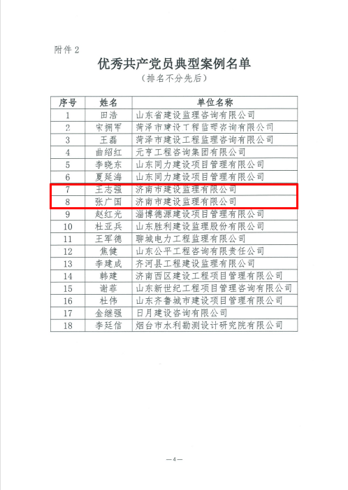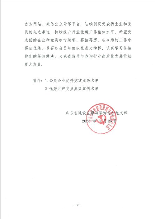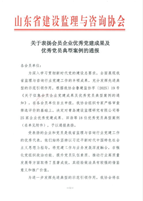 近日,山东省建设监理与咨询协会发布会员企业优秀党建成果及优秀党员典型案例通报,我公司企业党建成果获评“优秀企业党建成果”、共产党员王志强、张广国的先进事迹获评“优秀党员典型案例”。